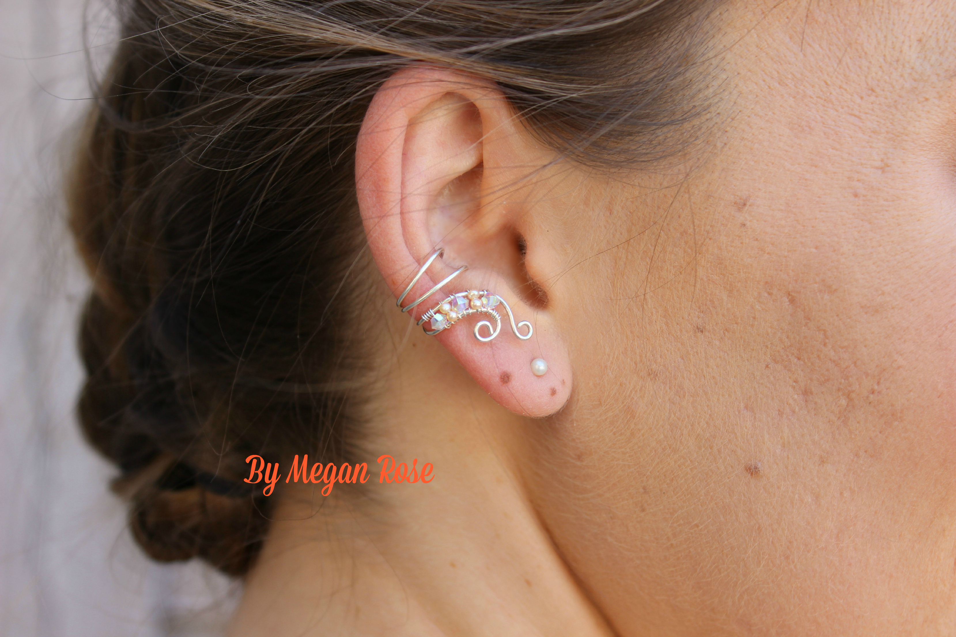 This stunning ear cuff features Swarovski Crystals and freshwater pearls. Available in sterling silver, gold-filled and rose gold-filled wire. It measures approximately 3/4" tall, and a 1/2" wide.