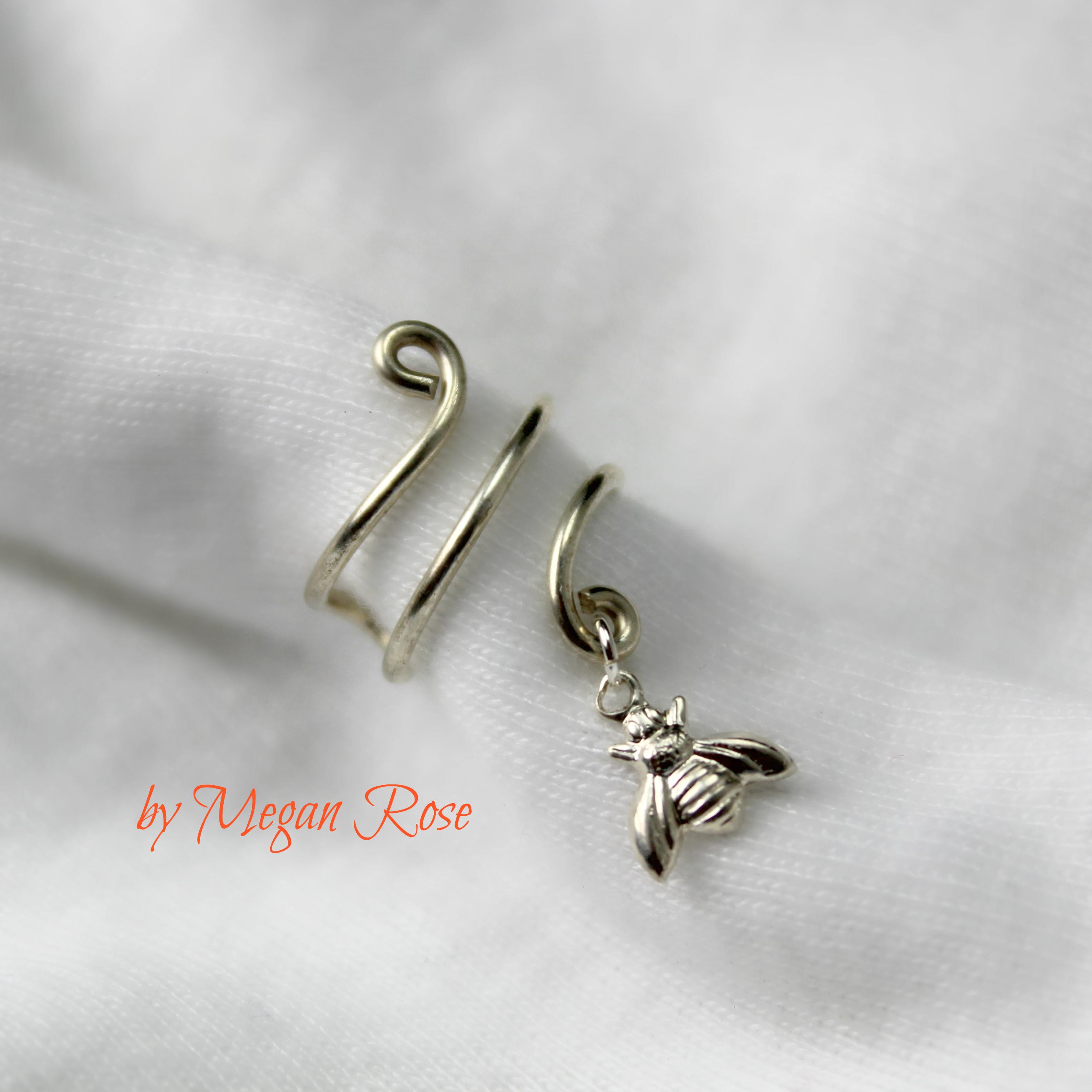 This delicate swirl ear cuff features a dainty dangling bumblebee charm. Solid sterling silver, this cuff requires no piercing and is fully adjustable for a comfortable and secure fit.